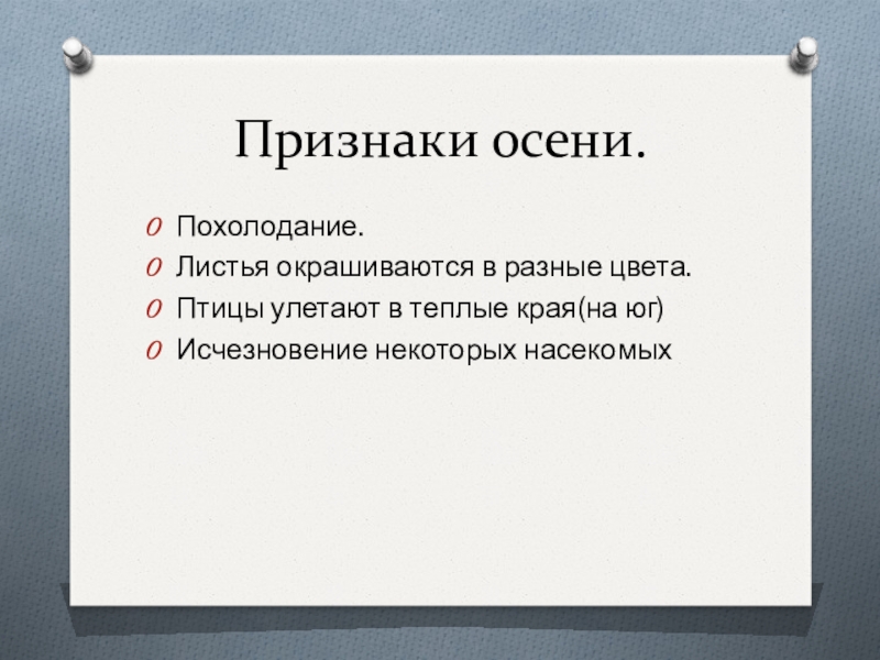 Признаки осени.Похолодание.Листья окрашиваются в разные цвета.Птицы улетают в теплые края(на юг)Исчезновение некоторых насекомых