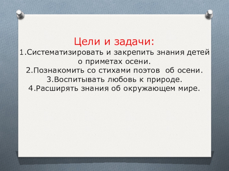 Слайд 2Цели и задачи: 1.Систематизировать и закрепить знания детей о приметах осени. 2.Познакомить со