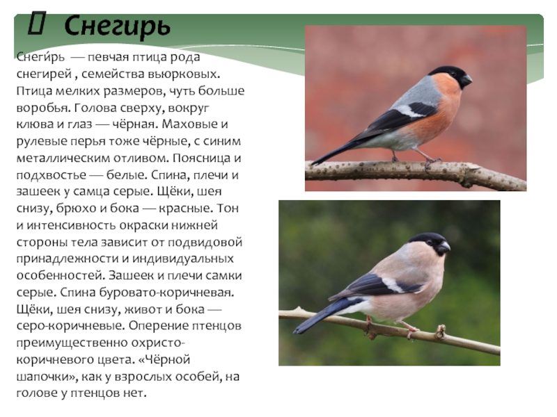 Снеги́рь — певчая птица рода снегирей , семейства вьюрковых.