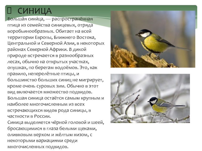 Больша́я сини́ца, — распространённая птица из семейства синицевых, отряда воробьинообразных. Обитает