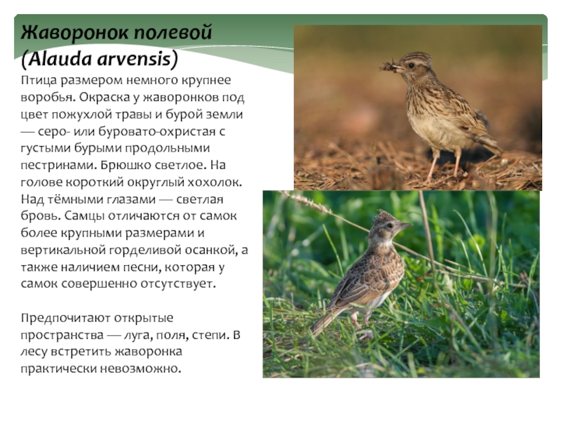 Птица размером немного крупнее воробья. Окраска у жаворонков