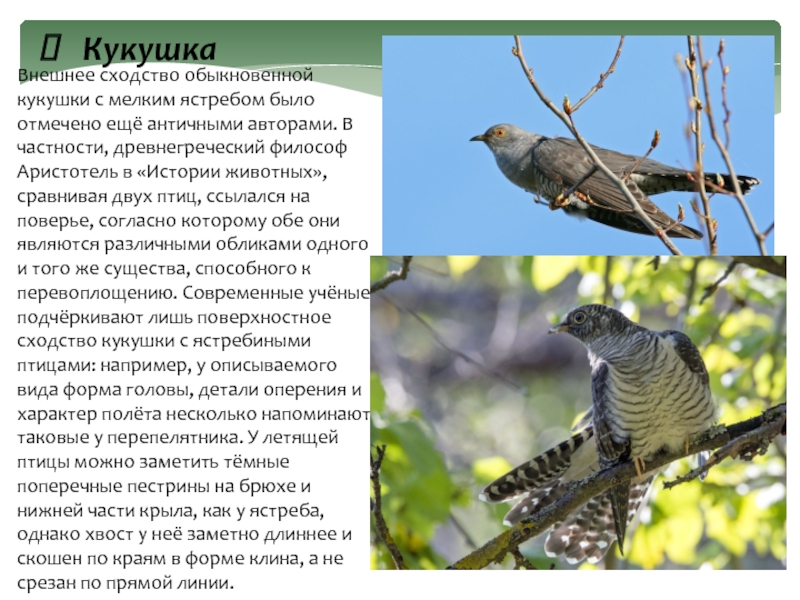 Внешнее сходство обыкновенной кукушки с мелким ястребом было отмечено ещё античными