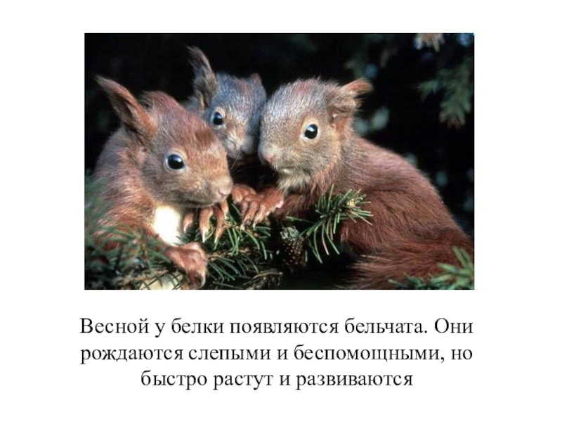 Весной у белки появляются бельчата. Они рождаются слепыми и беспомощными, но быстро растут и развиваются