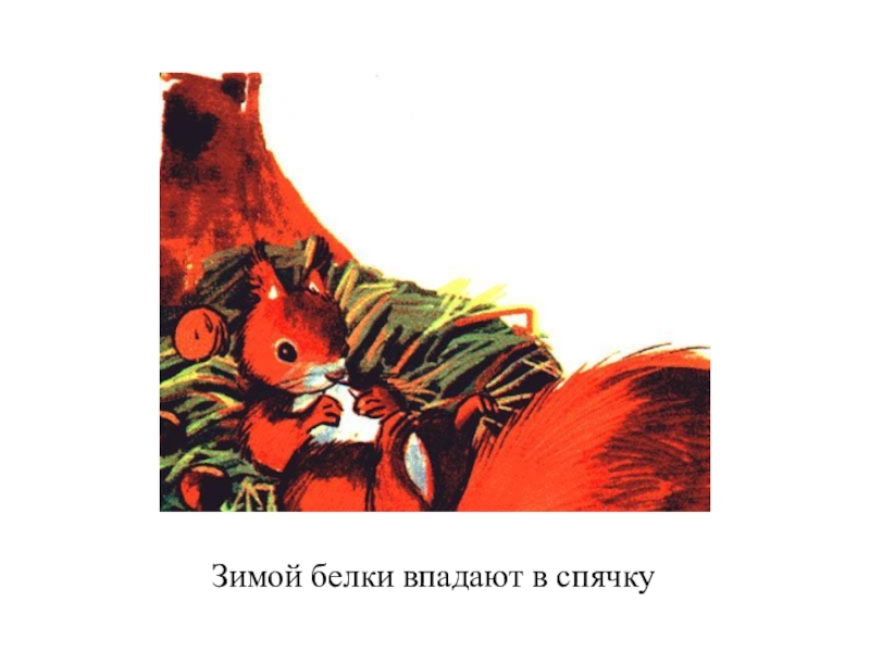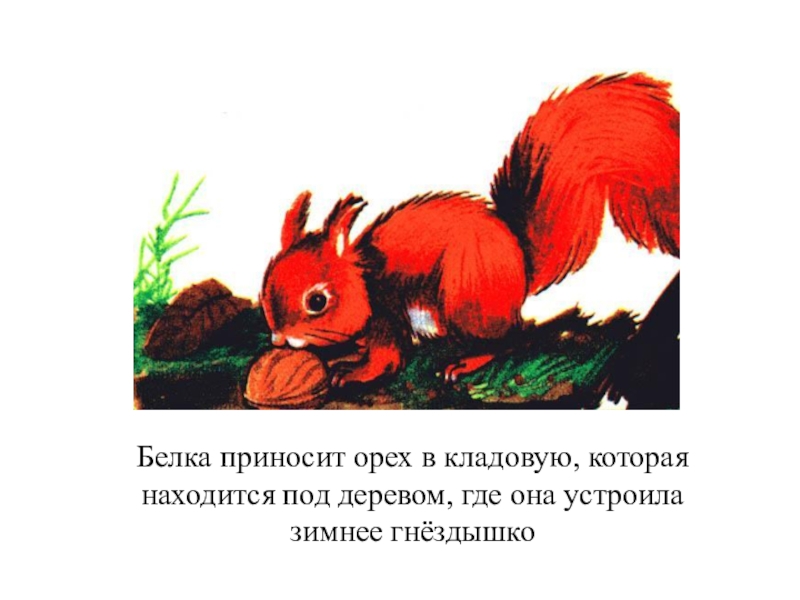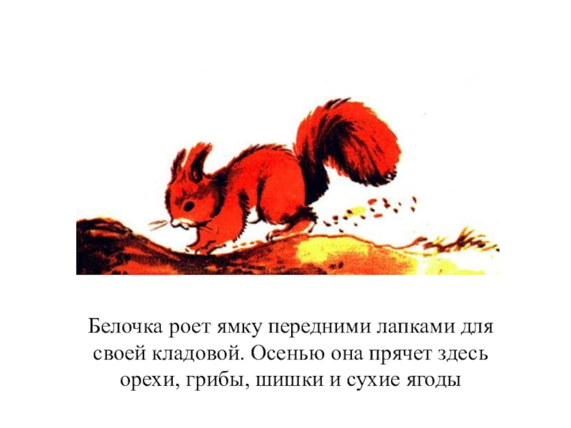 Белочка роет ямку передними лапками длясвоей кладовой. Осенью она прячет здесьорехи, грибы, шишки и сухие ягоды
