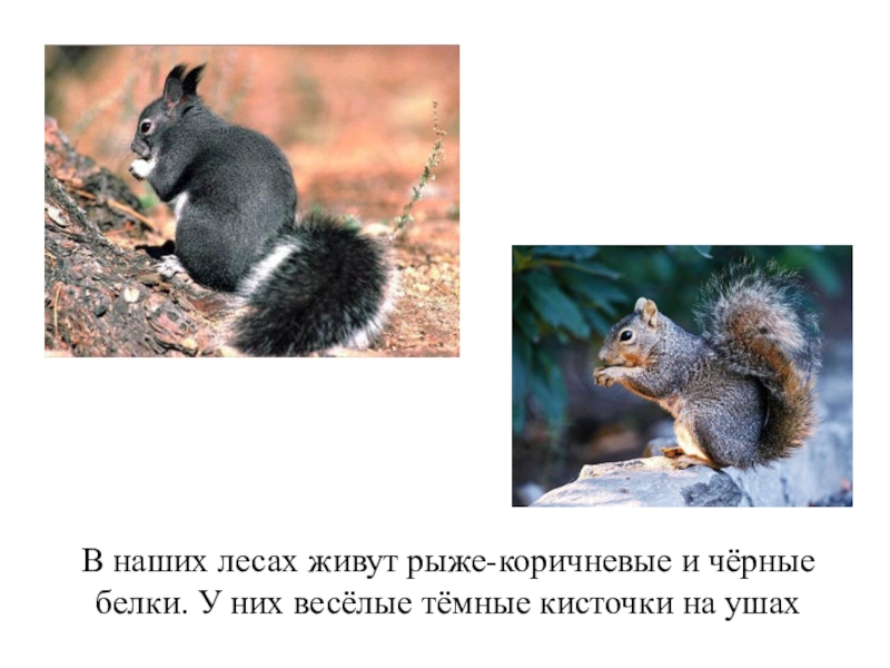 В наших лесах живут рыже-коричневые и чёрные белки. У них весёлые тёмные кисточки на ушах