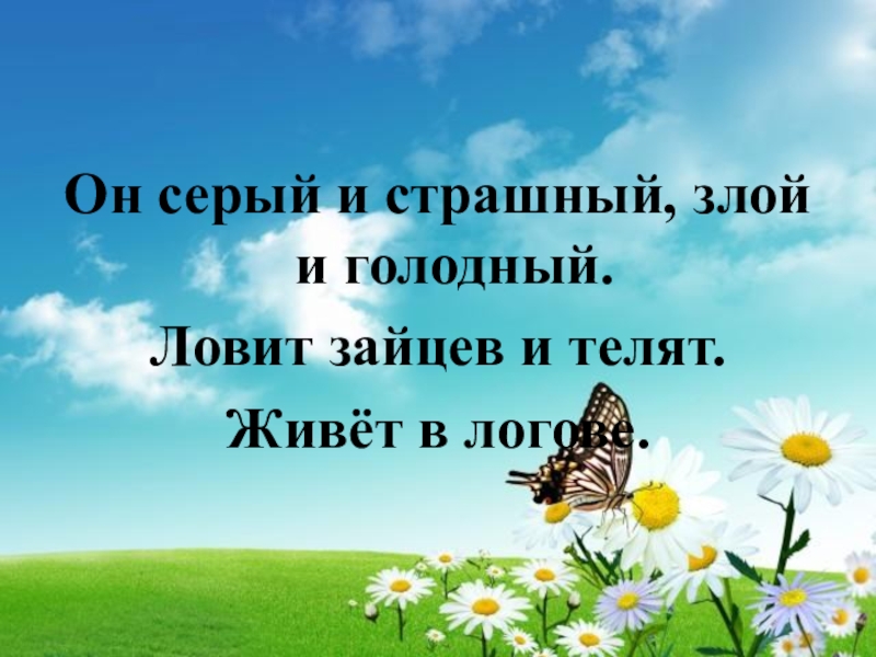 Он серый и страшный, злой и голодный. Ловит зайцев и телят. Живёт в логове.