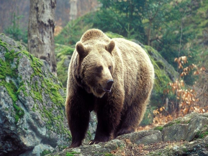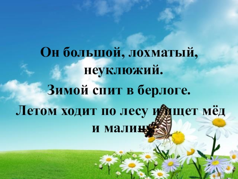 Он большой, лохматый, неуклюжий. Зимой спит в берлоге. Летом ходит по лесу и ищет мёд и малину.