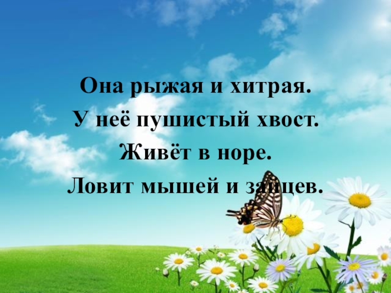 Она рыжая и хитрая. У неё пушистый хвост. Живёт в норе. Ловит мышей и зайцев.