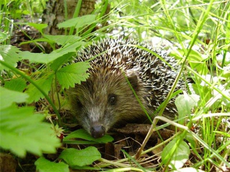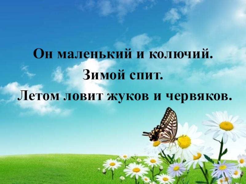 Он маленький и колючий.Зимой спит. Летом ловит жуков и червяков.