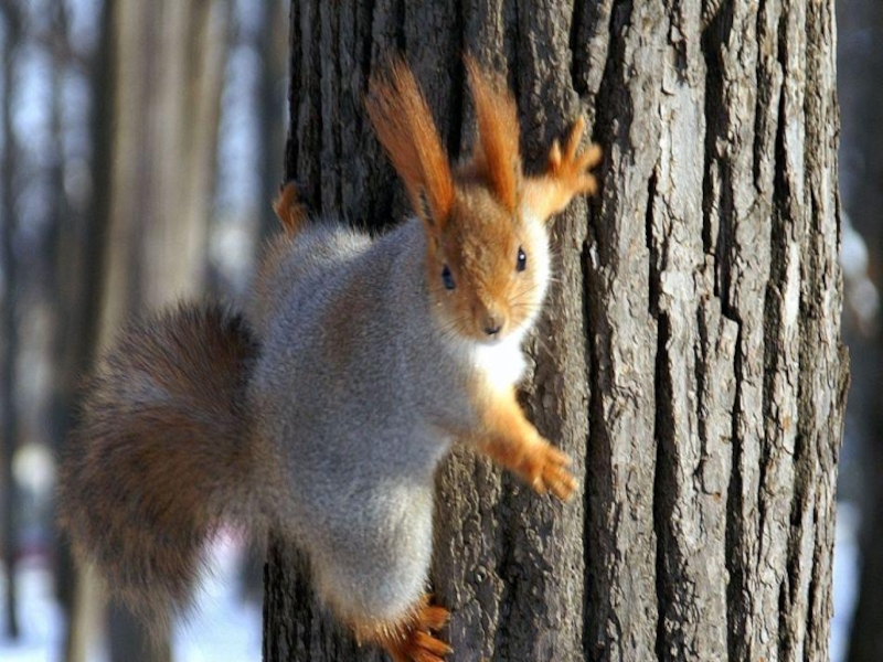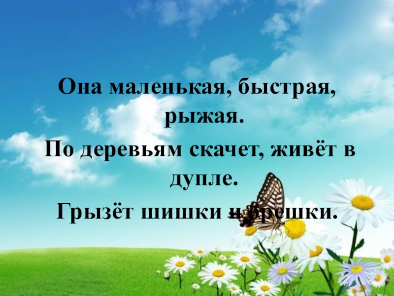 Она маленькая, быстрая, рыжая. По деревьям скачет, живёт в дупле. Грызёт шишки и орешки.