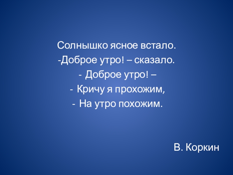 Солнышко ясное встало.-Доброе утро! – сказало.Доброе утро! – Кричу я прохожим, На утро похожим.В. Коркин