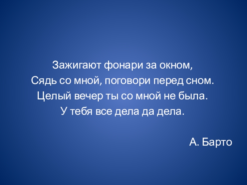 Зажигают фонари за окном,Сядь со мной, поговори перед сном.Целый вечер ты со мной не была.У тебя все