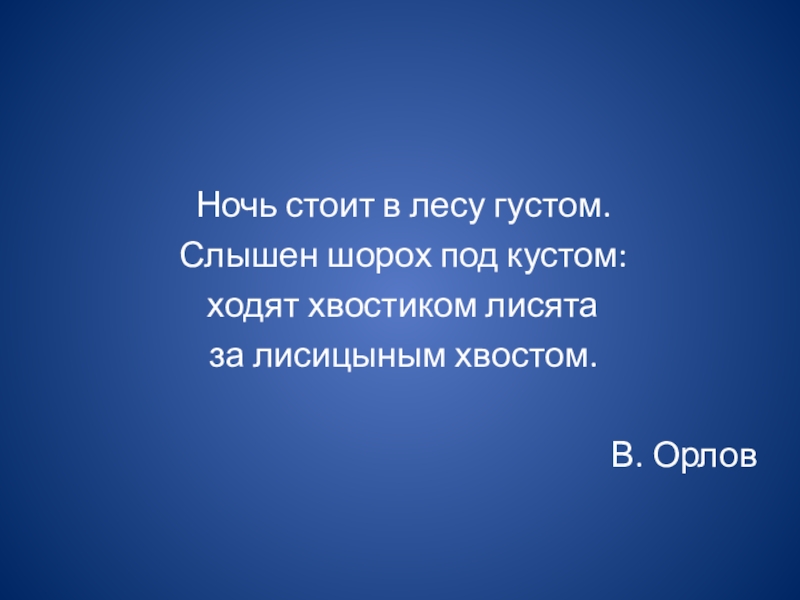 Ночь стоит в лесу густом.Слышен шорох под кустом:ходят хвостиком лисятаза лисицыным хвостом.В. Орлов