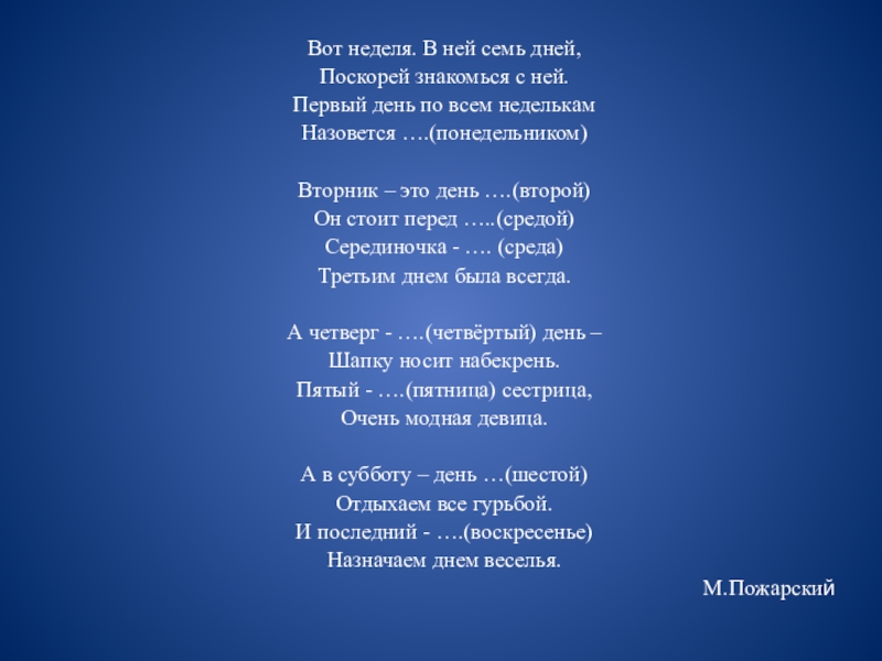 Вот неделя. В ней семь дней,Поскорей знакомься с ней.Первый день по всем неделькамНазовется ….(понедельником)Вторник – это день