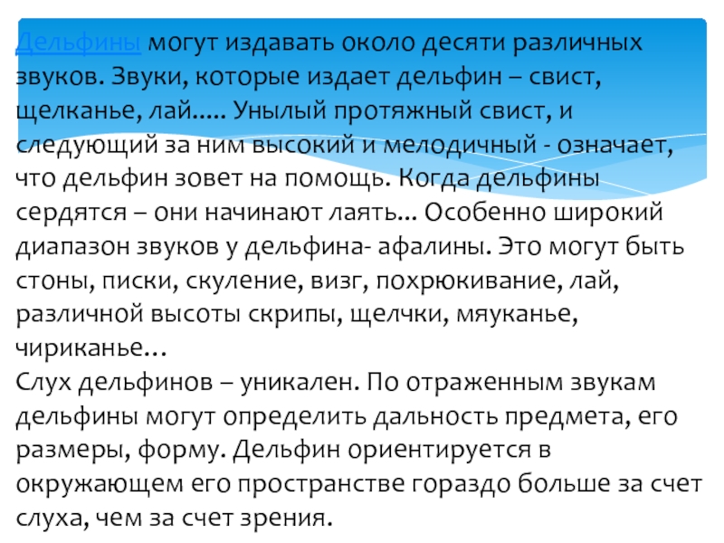 Слух дельфинов – уникален. По отраженным звукам дельфины могут определить дальность предмета, его размеры, форму. Дельфин ориентируется в окружающем его пространстве гораздо больше за счет слуха, чем за счет зрения.