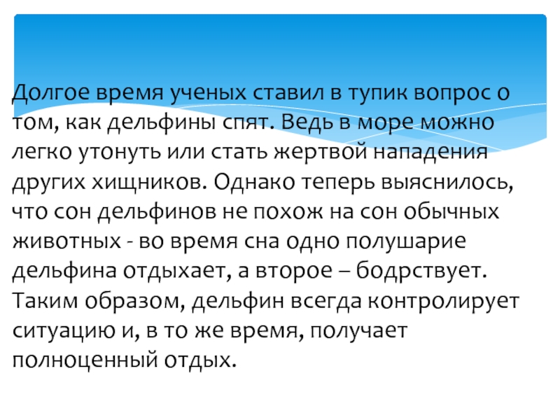 Слайд 14Долгое время ученых ставил в тупик вопрос о том, как дельфины