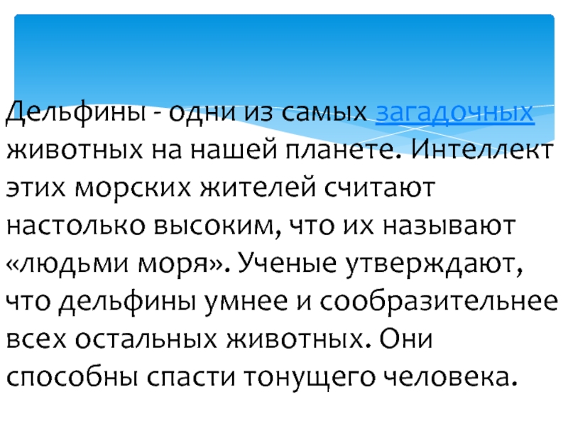 Слайд 4Дельфины - одни из самых загадочных животных на нашей планете. Интеллект