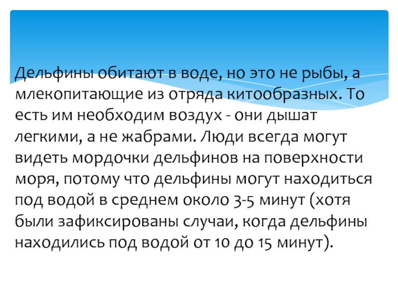 отряда китообразных. То есть им необходим воздух - они дышат легкими, а не жабрами. Люди всегда могут видеть мордочки дельфинов на поверхности моря, потому что дельфины могут находиться под водой в среднем около 3-5 минут (хотя были зафиксированы случаи, когда дельфины находились под водой от 10 до 15 минут).