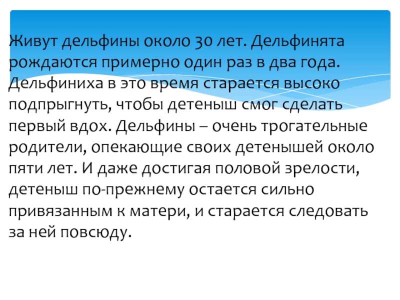 Слайд 16Живут дельфины около 30 лет. Дельфинята рождаются примерно один раз в