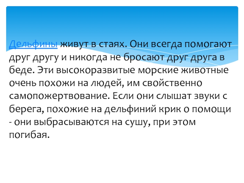 Слайд 8Дельфины живут в стаях. Они всегда помогают друг другу и никогда