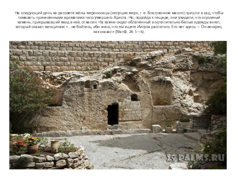 масло) пришли в сад, чтобы помазать принесёнными ароматами тело умер­шего Христа. Но, подойдя к пещере, они увидели, что огромный камень, прикрывавший вход в неё, отвален. На камне сидел облачённый в ослепительно-белые одежды ангел, который сказал женщинам: «...не бой­тесь, ибо знаю, что вы ищете Иисуса распятого; Его нет здесь — Он воскрес, как сказал» (Матф. 28: 5—6).