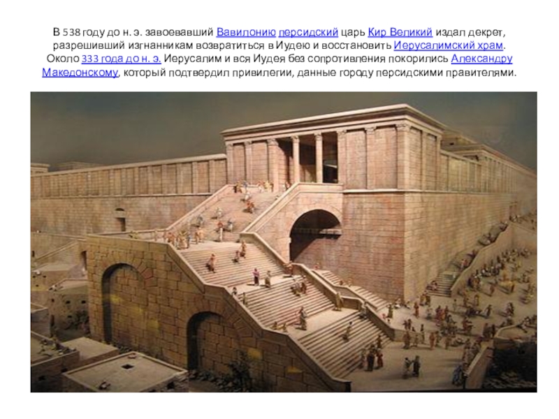 Слайд 4В 538 году до н. э. завоевавший Вавилонию персидский царь Кир Великий издал декрет, разрешивший изгнанникам возвратиться в