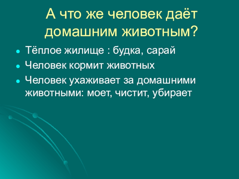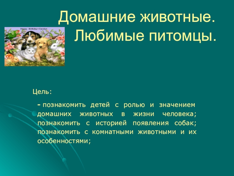 - познакомить детей с ролью и значением домашних животных в жизни человека; познакомить с историей появления собак; познакомить с комнатными животными и их особенностями;