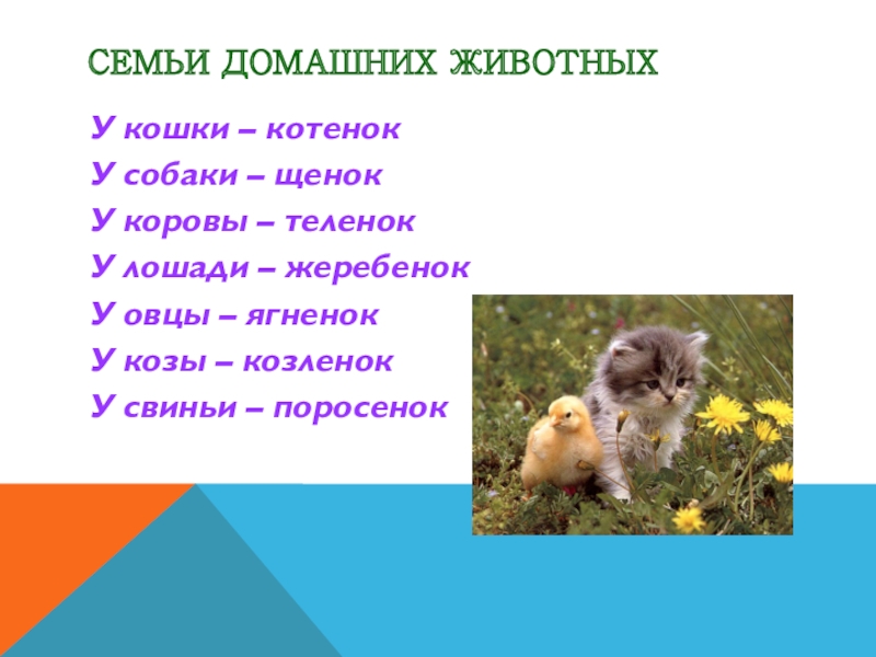 Семьи домашних животныхУ кошки – котенокУ собаки – щенокУ коровы – теленокУ лошади – жеребенокУ овцы –