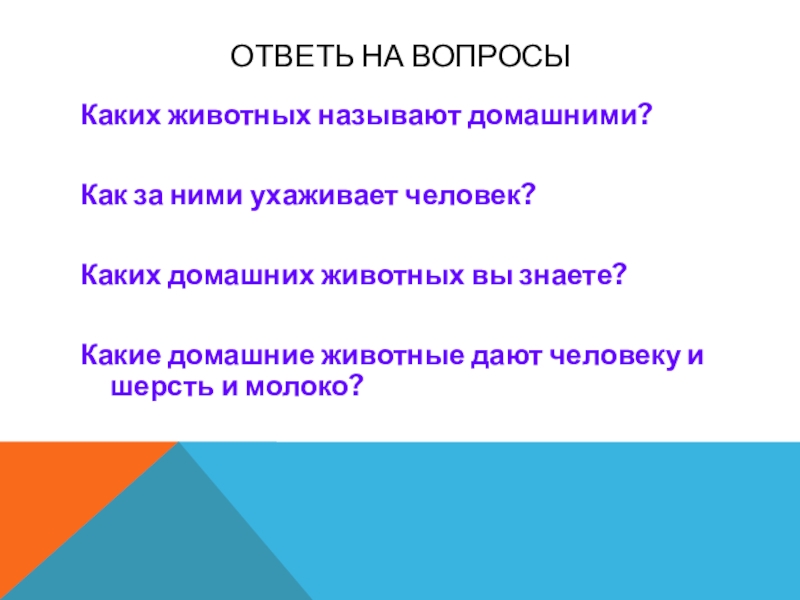 Ответь на вопросыКаких животных называют домашними?Как за ними ухаживает человек?Каких домашних животных вы знаете?Какие домашние животные дают