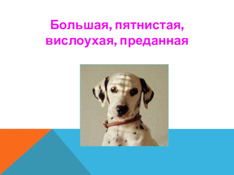 Слайд 4Большая, пятнистая, вислоухая, преданная