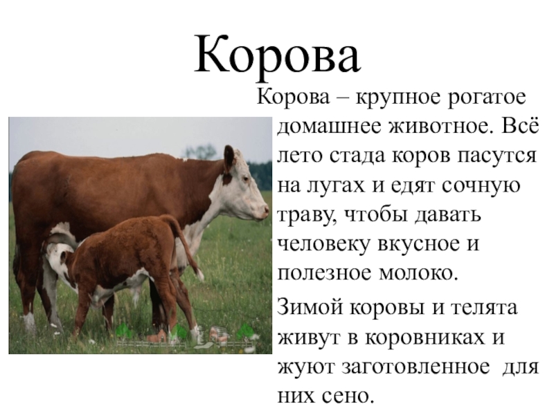 КороваКорова – крупное рогатое домашнее животное. Всё лето стада коров пасутся на лугах и едят сочную траву, чтобы давать человеку вкусное и полезное молоко.Зимой коровы и телята живут в коровниках и жуют заготовленное для них сено.