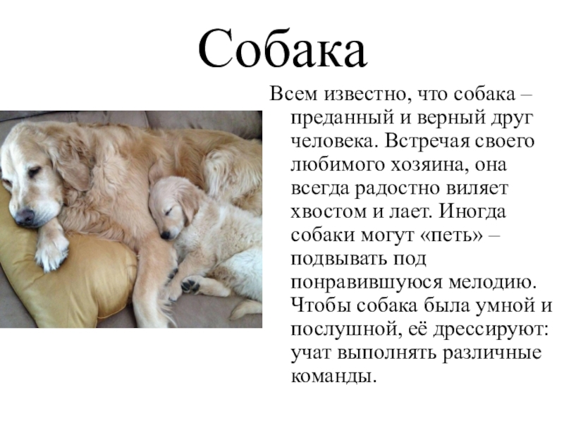 своего любимого хозяина, она всегда радостно виляет хвостом и лает. Иногда собаки могут «петь» – подвывать под понравившуюся мелодию. Чтобы собака была умной и послушной, её дрессируют: учат выполнять различные команды.