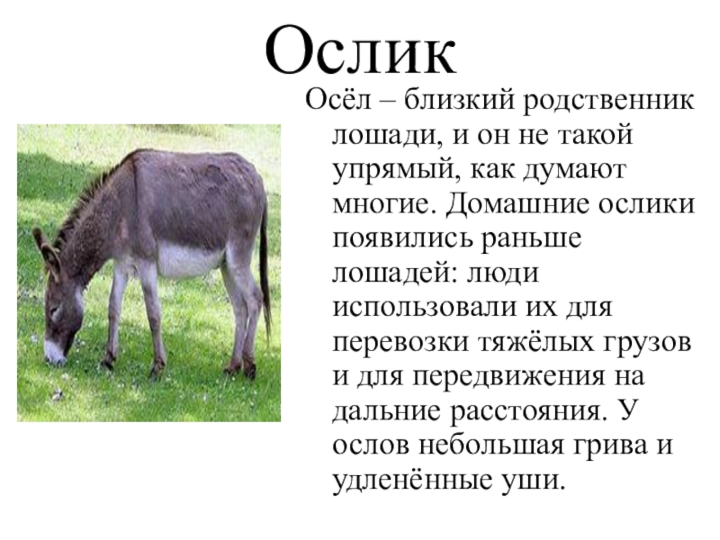 ОсликОсёл – близкий родственник лошади, и он не такой упрямый, как думают многие. Домашние ослики появились раньше
