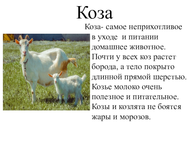 КозаКоза- самое неприхотливое в уходе и питании домашнее животное. Почти у всех коз растет борода, а тело