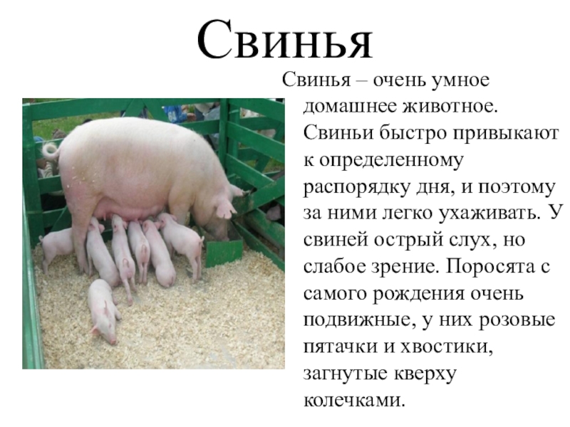 распорядку дня, и поэтому за ними легко ухаживать. У свиней острый слух, но слабое зрение. Поросята с самого рождения очень подвижные, у них розовые пятачки и хвостики, загнутые кверху колечками.