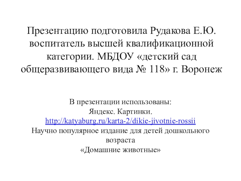 В презентации использованы: Яндекс. Картинки. http://katyaburg.ru/karta-2/dikie-jivotnie-rossii Научно популярное издание для детей дошкольного возраста «Домашние животные» Презентацию подготовила