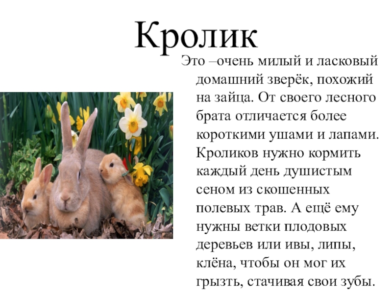 своего лесного брата отличается более короткими ушами и лапами. Кроликов нужно кормить каждый день душистым сеном из скошенных полевых трав. А ещё ему нужны ветки плодовых деревьев или ивы, липы, клёна, чтобы он мог их грызть, стачивая свои зубы.