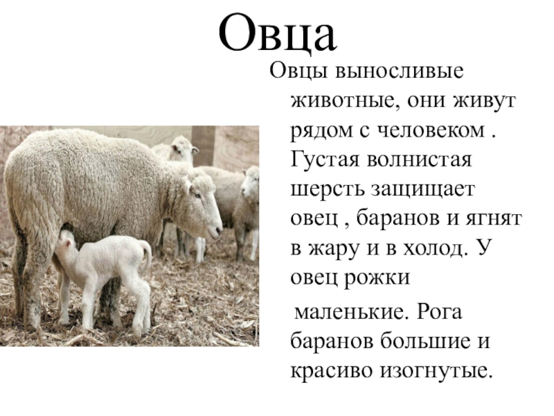 ОвцаОвцы выносливые животные, они живут рядом с человеком . Густая волнистая шерсть защищает овец , баранов и