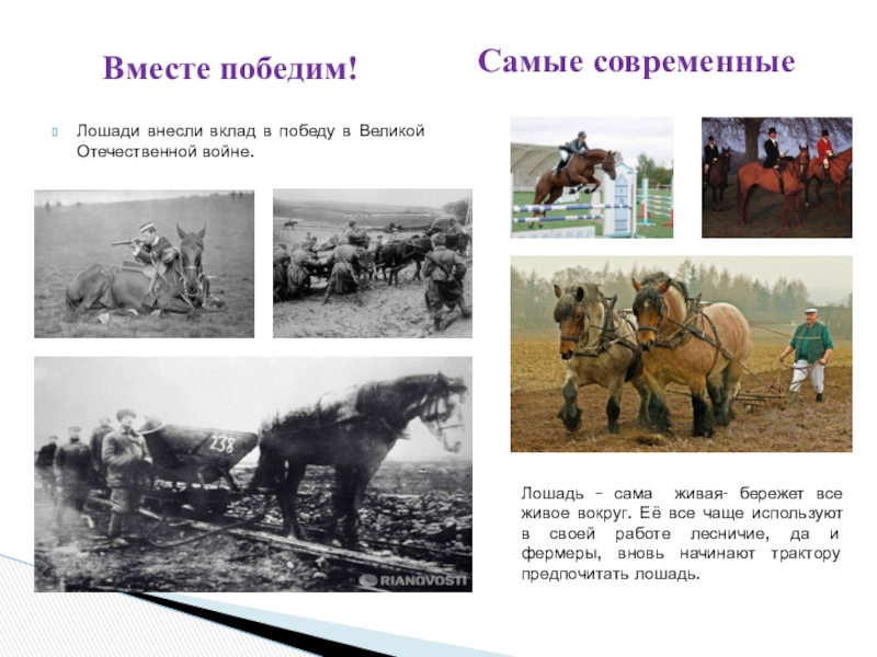 Лошади перевозили не только людей, но и грузы, тянули за собой баржи и первые «трамваи». Они помогали крестьянам пахать и боронить, пасти скот. Пони вывозили уголь из под земли.
