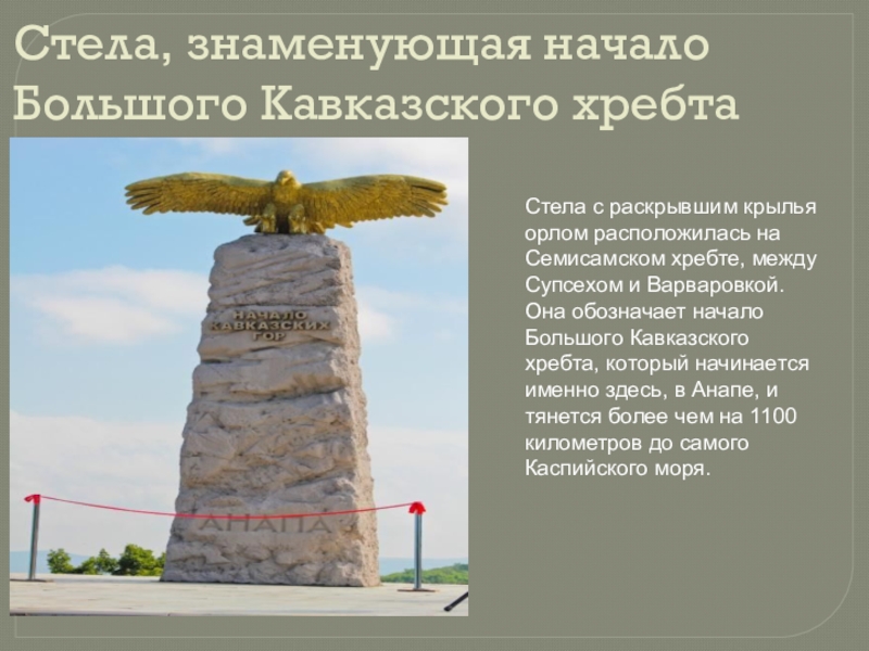Слайд 4Стела, знаменующая начало Большого Кавказского хребта