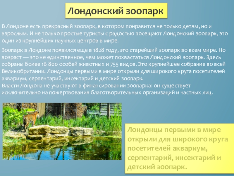 Зоопарк в Лондоне появился еще в 1828 году, это старейший зоопарк во всем мире. Но возраст — это не единственное, чем может похвастаться Лондонский зоопарк. Здесь собраны более 16 800 особей животных и 755 видов. Это крупнейшее собрание во всей Великобритании. Лондонцы первыми в мире открыли для широкого круга посетителей аквариум, серпентарий, инсектарий и детский зоопарк.
