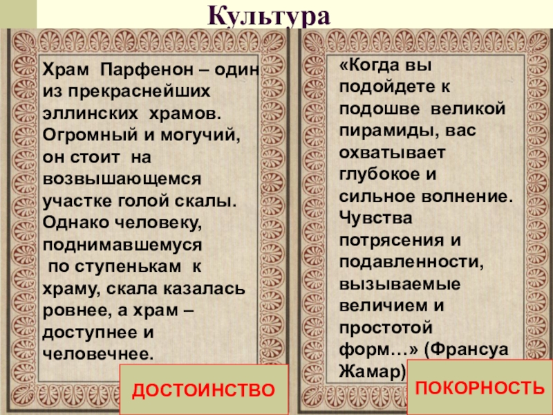 «Когда вы подойдете к подошве великой пирамиды, вас охватывает глубокое и сильное волнение. Чувства потрясения и подавленности, вызываемые величием и простотой форм…» (Франсуа Жамар)