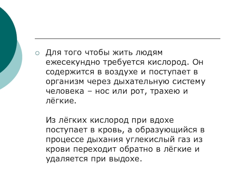 Для того чтобы жить людям ежесекундно требуется кислород. Он содержится в воздухе и поступает в организм через