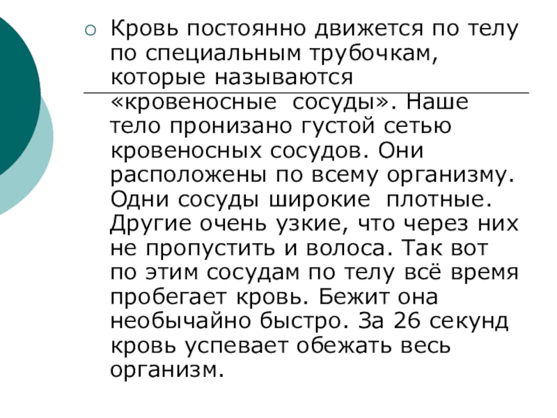сосуды». Наше тело пронизано густой сетью кровеносных сосудов. Они расположены по всему организму. Одни сосуды широкие  плотные. Другие очень узкие, что через них не пропустить и волоса. Так вот по этим сосудам по телу всё время пробегает кровь. Бежит она необычайно быстро. За 26 секунд кровь успевает обежать весь организм.