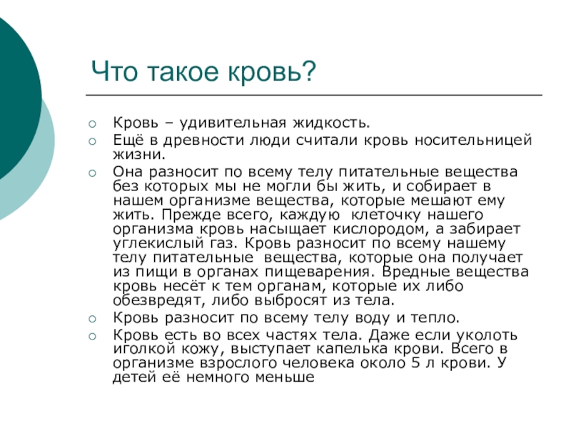 Что такое кровь?Кровь – удивительная жидкость.Ещё в древности люди считали кровь носительницей жизни.Она разносит по всему телу