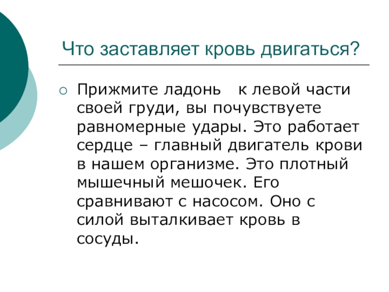 Что заставляет кровь двигаться?Прижмите ладонь   к левой части своей груди, вы почувствуете равномерные удары. Это работает