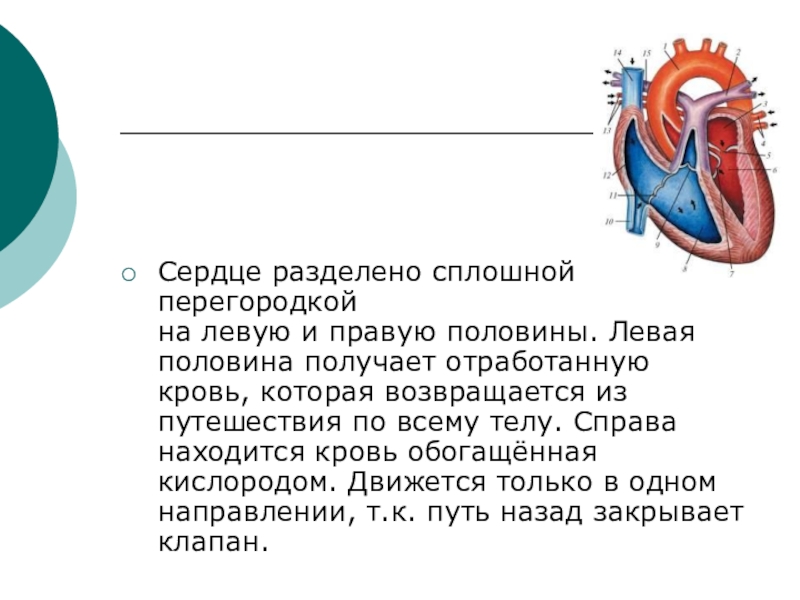 Сердце разделено сплошной перегородкой на левую и правую половины. Левая половина получает отработанную кровь, которая возвращается из путешествия по всему телу.
