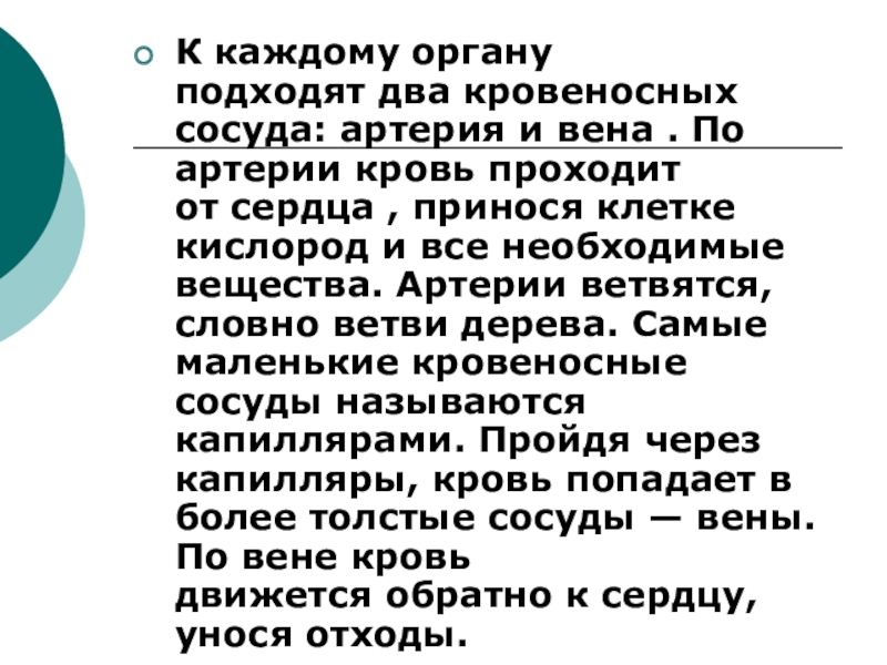 К каждому органу подходят два кровеносных сосуда: артерия и вена . По артерии кровь проходит от сердца , принося