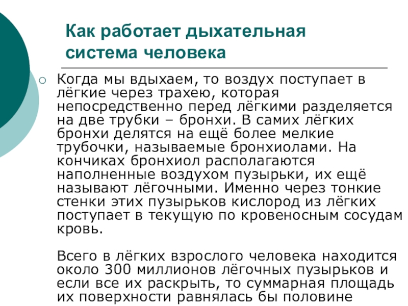Как работает дыхательная система человекаКогда мы вдыхаем, то воздух поступает в лёгкие через трахею, которая непосредственно перед