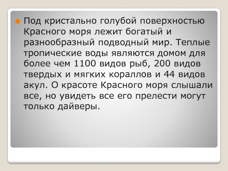 Слайд 5Под кристально голубой поверхностью Красного моря лежит богатый и разнообразный подводный